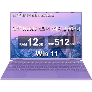 16 노트북 12GB+512GB 인텔 N5095(최대 2.9Ghz) 4코어 Win 11 2.5K FHD 스크린(냉각팬 포함) 듀얼 WiFi 지원 1TB SSD 확장-보라, WIN11 Pro, 보라, 12GB, 512GB, A6