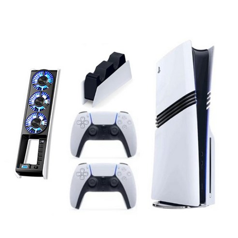 플레이스테이션 5 프로 슬림 모델을 안정적으로 세워둘 수 있는 수직 거치대 스탠드, LED 조명으로 시각적 효과를 더하고 공간 효율성을 높여주는 제품.