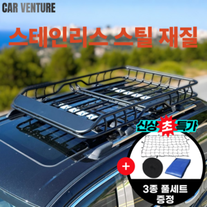 전차종 차량에 호환 가능한 카벤처 스테인리스 루프바스켓으로, 블랙 컬러 디자인과 견고한 소재로 튼튼하며, 간편한 설치로 캠핑, 여행 등 다양한 외출 시 짐을 안전하게 운반할 수 있는 제품입니다.