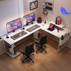 탄소섬유 화이트 상판과 L자형 구조를 갖춘 코너형 게이밍 컴퓨터 책상으로, 넓은 작업 공간과 다양한 장비 배치가 가능하여 유튜버용으로도 적합합니다.