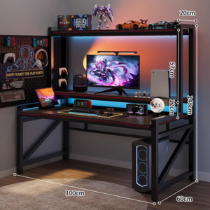 C자형 구조와 하단 선반을 갖춘 게이밍 및 사무용 책상으로, 다양한 크기 선택이 가능하며 다용도 수납 공간으로 효율적인 작업 환경을 제공합니다.