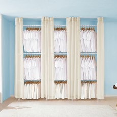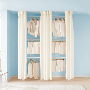 튼튼한 설치형 철제 구조의 드레스룸 행거로, 커튼으로 옷을 보호하며 효율적인 수납과 깔끔한 공간 정리가 가능하고 아이보리 색상으로 밝은 인테리어를 연출할 수 있는 제품입니다.