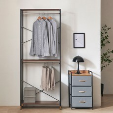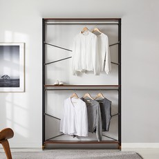 조립식 철제 구조로 안정적이며, 와이드 디자인으로 옷과 소품을 넉넉하게 수납할 수 있고, 월넛과 블랙 프레임 조합으로 세련된 인테리어 연출이 가능한 드레스룸 행거입니다.