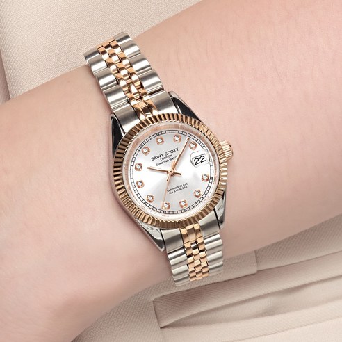 세인트스코트 정품 커플 시계로, 천연 다이아몬드가 세팅된 고급스러운 디자인에 사파이어 글라스를 사용해 내구성이 뛰어나며 감별서와 쇼핑백이 함께 제공되는 세트 상품입니다.