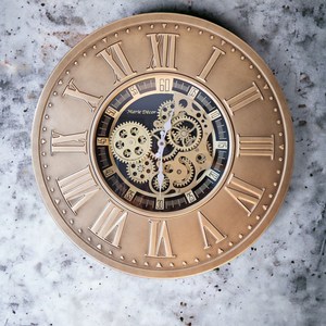 빈티지 골드 컬러와 무빙 기어 디자인이 조화를 이루는 벽시계로, 시각적 재미와 함께 시간을 확인할 수 있어 거실이나 사무실 인테리어에 적합합니다.