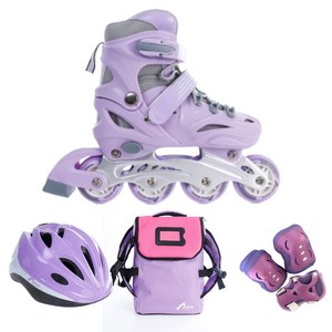 안정적인 착용감과 부드러운 주행이 가능한 인라인 스케이트 세트로, 초보자부터 중급자까지 사용하기 적합하며 헬멧, 보호대 등 안전 장비가 포함되어 있어 안전하게 스케이트를 즐길 수 있음.
