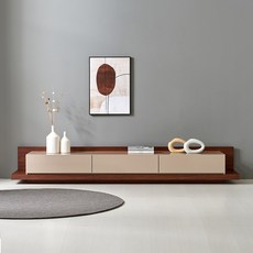 월넛그레이 색상과 LED 조명이 조화를 이루며 2300mm 폭의 확장형 구조로 넉넉한 수납과 장식이 가능한 낮은 3단 TV 거실장입니다.