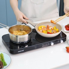 2구 인덕션 전기레인지로 프리스탠딩 설치가 가능하며, 듀얼 플레이트로 동시에 두 가지 요리를 효율적으로 조리할 수 있는 제품입니다.