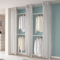튼튼한 철제 프레임과 설치형 커튼이 포함된 드레스룸용 옷걸이 행거로, 공간 활용이 효율적이며 다양한 의류를 정리할 수 있는 실용적인 수납 솔루션입니다.