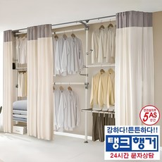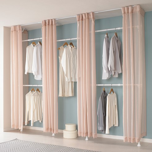 튼튼한 철제 프레임과 설치형 설계로 공간 활용이 뛰어난 드레스룸 행거로, 커튼이 포함되어 의류를 깔끔하게 정리하고 보호할 수 있는 제품입니다.