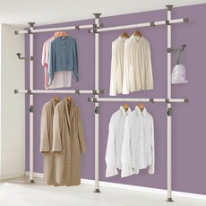 튼튼한 철제 프레임과 4단 구조로 안정성이 뛰어난 드레스룸용 옷걸이로, 다양한 의류를 안전하게 수납할 수 있는 실용적인 시스템 행거입니다.