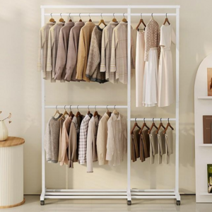 튼튼한 철제 프레임과 2단 구조로 실용적인 수납이 가능한 이동식 스탠드 행거로, 공간 활용이 용이하며 다양한 의류를 정리할 수 있는 제품입니다.