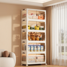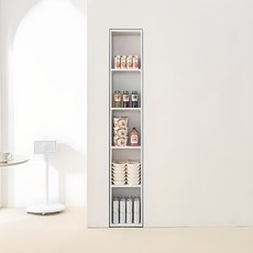 키 큰 구조와 5단 오픈형 디자인으로 냉장고 옆 틈새 공간을 효율적으로 활용할 수 있는 화이트 주방 수납장입니다.