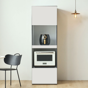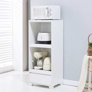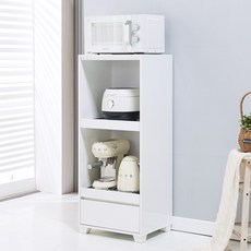 전자렌지와 밥솥을 효율적으로 수납할 수 있는 3단 구조의 주방 수납장으로, 화이트 색상과 깔끔한 디자인으로 주방 공간을 정리하며 다양한 조리 기구를 편리하게 보관할 수 있는 제품입니다.