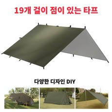 3x3, 3x4, 4x4m 크기의 직사각형 캠핑 타프로, 방수 기능과 UV50 차단 기능이 있어 야외 활동 시 그늘과 보호를 제공하며 19개의 걸이점으로 다양한 설치가 가능한 올리브 그린 타프입니다.