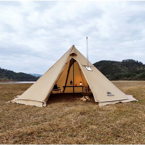 티피텐트 글램핑용 대형 텐트로, 3인부터 6인까지 사용 가능하며 화목난로 연통 구멍이 있어 난방용 설치가 편리하고 야외 활동에 적합한 구조를 갖춘 제품입니다.