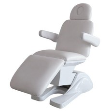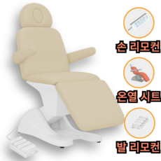 3개의 모터와 온열 기능이 적용되어 높낮이와 각도 조절이 가능하며, 아이보리 색상으로 깔끔하고 편안하게 사용할 수 있는 미용 전동 베드.