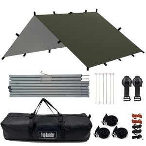탑 랜더 19개의 연결 고리가 있는 다용도 대형 렉타 캠핑 방수 타프 차량용어닝 야외용 UV 차단, 올리브 그린, 타프 세트(실버 코팅 타프)
