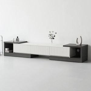 템바보드 디자인과 확장형 구조로 공간 활용이 뛰어난 그레이 색상 거실장으로 실용적이고 깔끔한 거실 연출이 가능하다.
