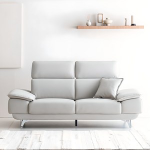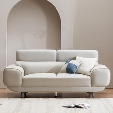헤드 무빙 기능이 적용된 3인용 가죽 소파로, 라이트 베이지 색상과 고급 가죽 소재로 편안한 착석감과 세련된 거실 분위기를 제공하며 다양한 공간에 조화롭게 배치할 수 있다.