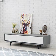 그레이 색상과 깔끔한 디자인으로 모던한 거실 분위기를 연출하며, 4단 구조로 TV와 다양한 소품을 효율적으로 수납할 수 있는 거실장입니다.