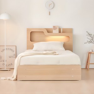 메이플 색상의 LED 조명 수납 SS침대와 양면 매트리스가 세트로 구성되어 편리한 수납과 편안한 수면을 동시에 제공하는 제품입니다.