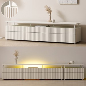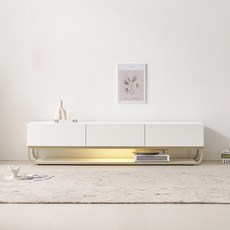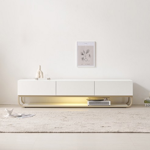 화이트 색상과 스틸 프레임이 조화를 이루는 1800 LED 거실장으로, 서랍 수납과 조명 기능을 갖춰 거실 공간을 깔끔하고 현대적으로 연출할 수 있는 제품입니다.
