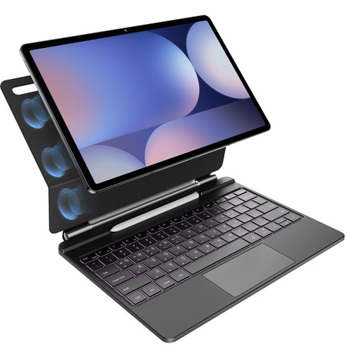 갤럭시탭 S10 FE 플러스 13.1인치와 호환되는 마그네틱 키보드 케이스로 S펜 수납이 가능하며 보호와 편리한 입력을 동시에 제공함.