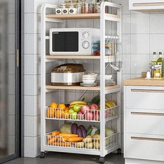 주방용 전자레인지와 다양한 용품을 효율적으로 정리할 수 있는 이동식 금속 수납선반으로, 다용도 활용이 가능하며 흰색 디자인으로 깔끔한 주방 환경을 유지할 수 있는 제품입니다.