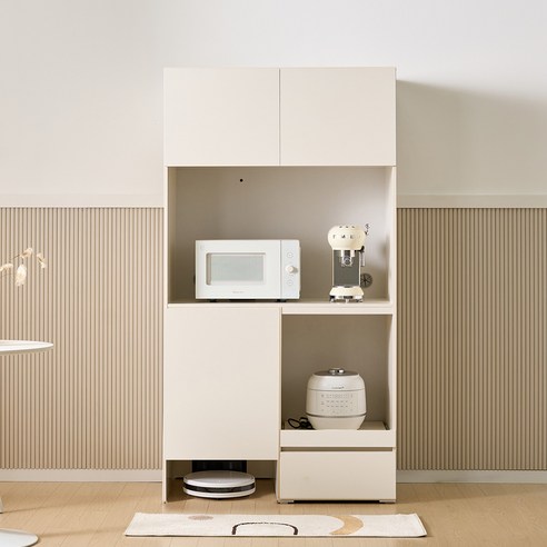 광폭 설계로 주방 공간을 효율적으로 활용할 수 있는 수납장으로, 상부장과 하부장 구성으로 다양한 주방용품과 전자렌지, 로봇청소기 등을 깔끔하게 정리할 수 있는 제품입니다.