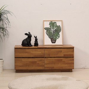 멀바우 소재로 제작되어 견고하며, 1200mm 폭과 2단 구조로 넓은 수납 공간을 제공하고, 4단 서랍으로 다양한 물품을 정리할 수 있으며, 우드 감성 디자인으로 따뜻하고 자연스러운 거실 분위기를 연출할 수 있음.