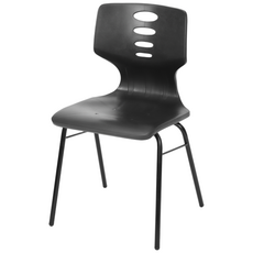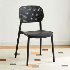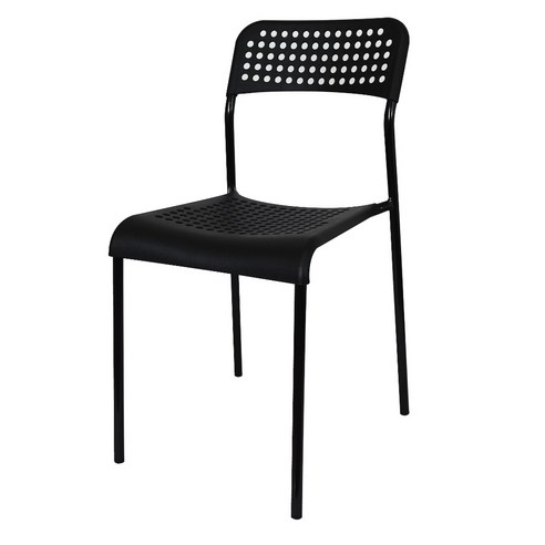 견고한 사출 플라스틱으로 제작되어 실내외 어디서나 사용할 수 있는 블랙 의자이며, 가벼우면서도 안정적인 착석감을 제공하고 청소와 관리가 용이함.