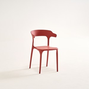 버건디 컬러와 모던한 디자인으로 카페와 가정 식탁에 잘 어울리며, 플라스틱 소재로 가볍고 튼튼하며 청소와 관리가 쉬운 실용적인 의자.