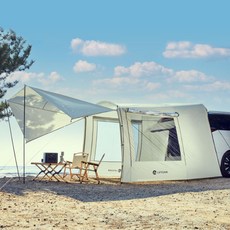 차량과 도킹 가능한 대형 차박텐트로, 방수 소재와 다용도 타프를 갖춰 3-6인용으로 야외 캠핑과 그늘막 설치에 적합함.