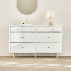 퍼리든 레가토 와이드 서랍장 1200 방문설치 화이트 + 골드 7단은 폭 1200mm의 넓은 와이드 사이즈에 세련된 화이트와 골드 포인트 디자인을 더해 다양한 옷과 소품을 정리하기 좋고 방문 설치로 바로 사용할 수 있는 실용적인 수납 가구입니다.