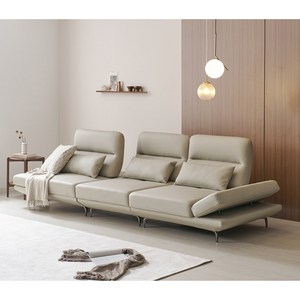 레옹 3인용 가죽 소파로, 무빙헤드 기능으로 개별 자세 조절이 가능하며, 아쿠아텍스 조야 원단과 생활방수 기능으로 관리가 편리하고, 넓은 좌석 공간으로 편안한 착석감을 제공한다.